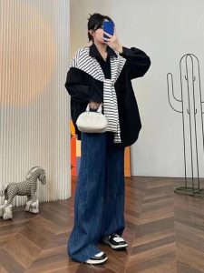 Khăn quàng vai như một phụ kiện tạo điểm nhấn, giúp tổng thể trang phục không bị đơn điệu. Túi xách lớn màu đen cũng là một phần quan trọng trong set đồ này, không chỉ tăng tính tiện dụng mà còn mang lại vẻ ngoài sang trọng.