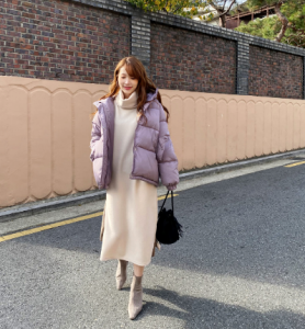 - Phối váy liền với áo phao ngắn